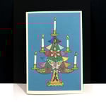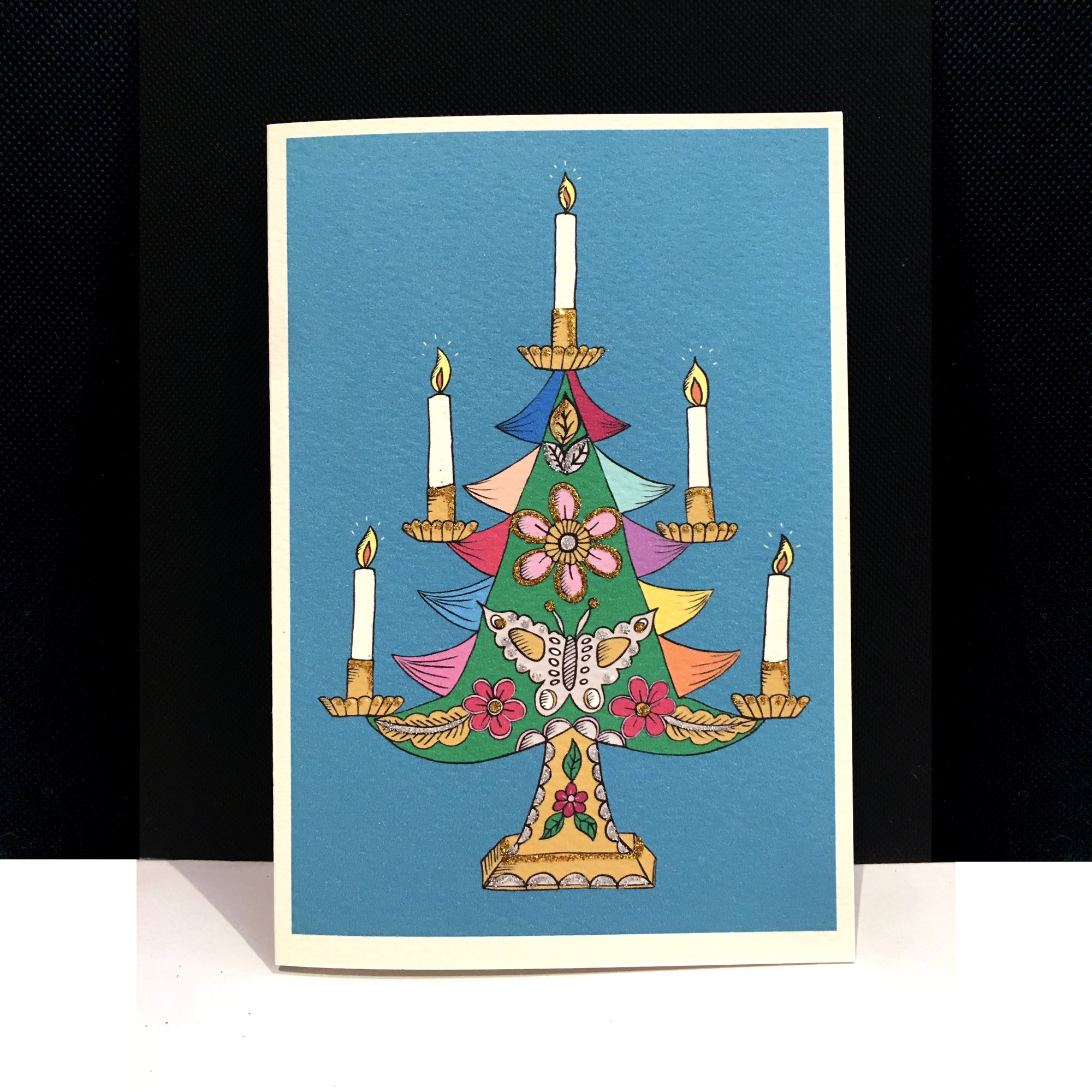 Illustrations based on traditional Mexican ornaments and hand finished with glittery highlights. The Christmas tree card has both gold and silver glitter.