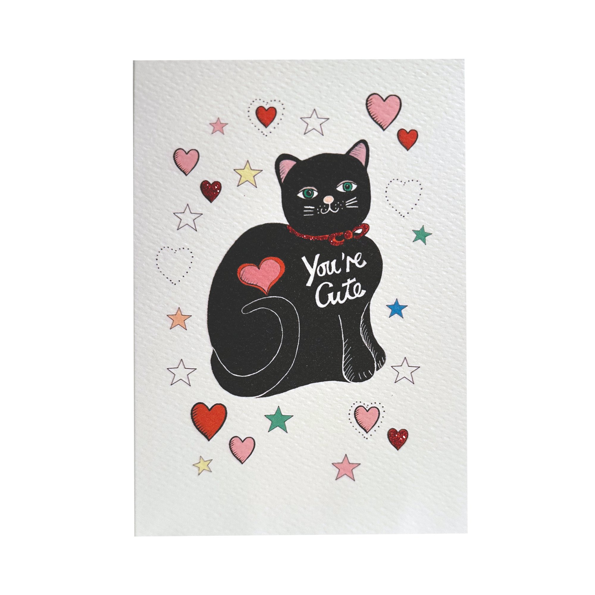 Illustrated card with a cute black cat surrounded by stars and hearts and the words 'You're Cute' in white on the cat's chest. Blank inside. Handmade in our London studio and delicately hand decorated with sparkly glitter.