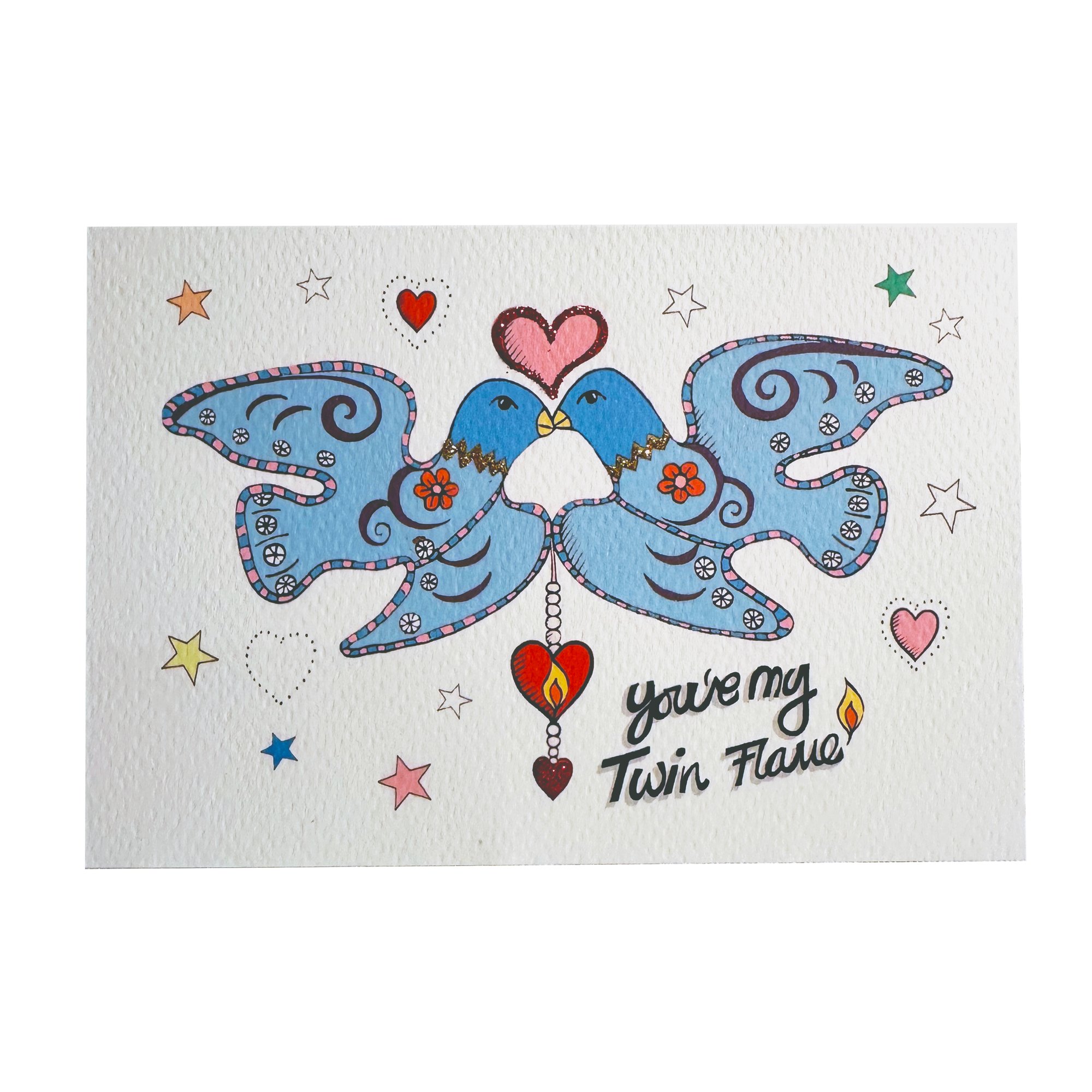 Illustrated card with 2 lovebirds kissing and words 'You're My Twin Flame'. Blank inside. Handmade in our London studio and delicately hand decorated with sparkly glitter.