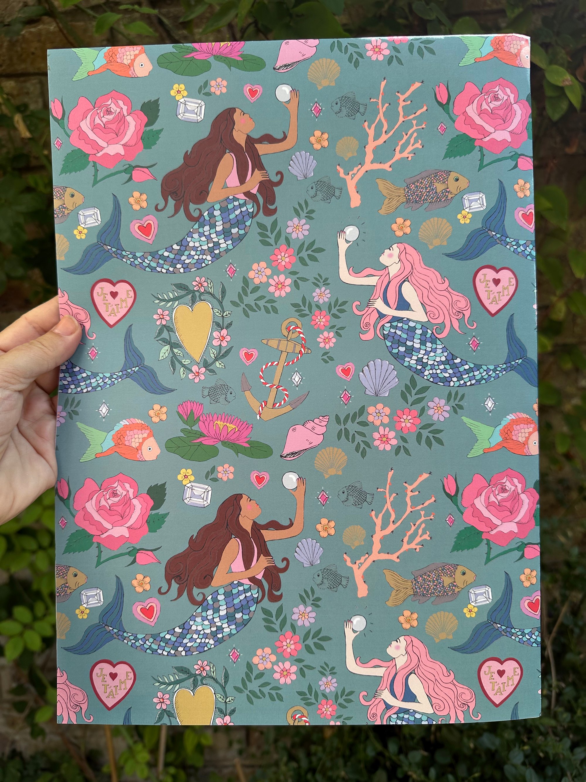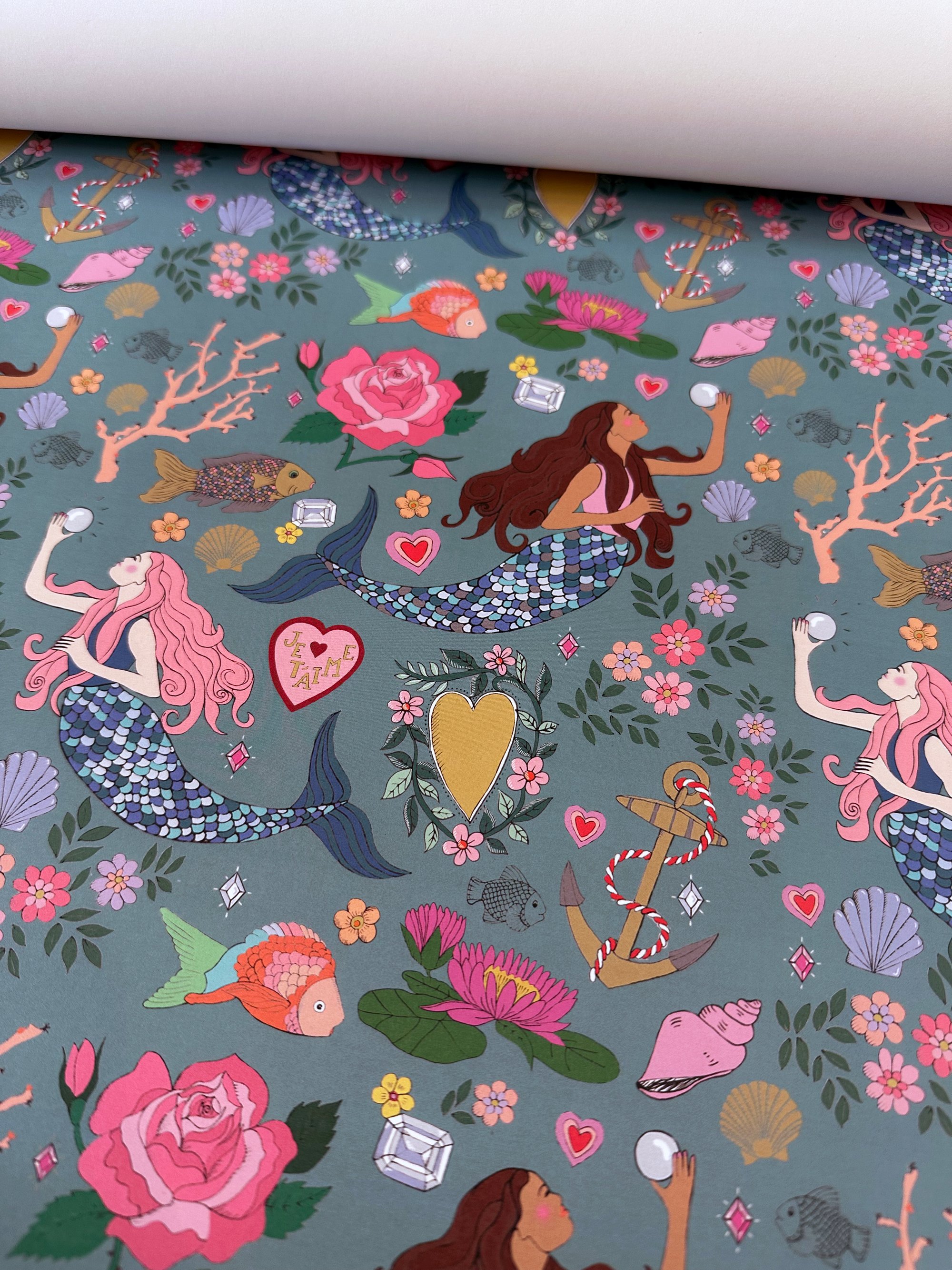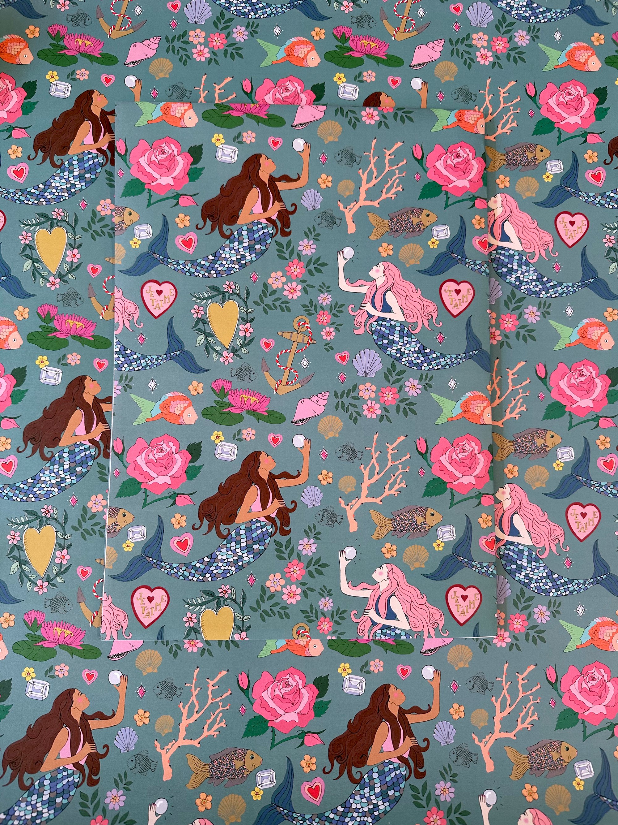 The prettiest pattern featuring mermaids, one with dark hair, the other with pink hair. They swim through an ocean of treasure where they have found a precious pearl.
