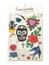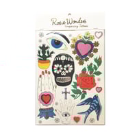 Day of the Dead Mexican inspired temporary tattoos. 1 A5 sheet with gold foil. Rosie Wonders Tattoos are skin safe and vegetarian. Remove with alcohol or baby oil. Images are printed in reverse.