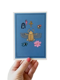 New cards with an Egyptian theme featuring Scarab Beetle and icons and hand finished with gold glitter.
