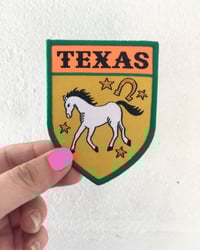 Texas travel patch featuring cute white horse and gold horseshoe and stars. size 80x60mm