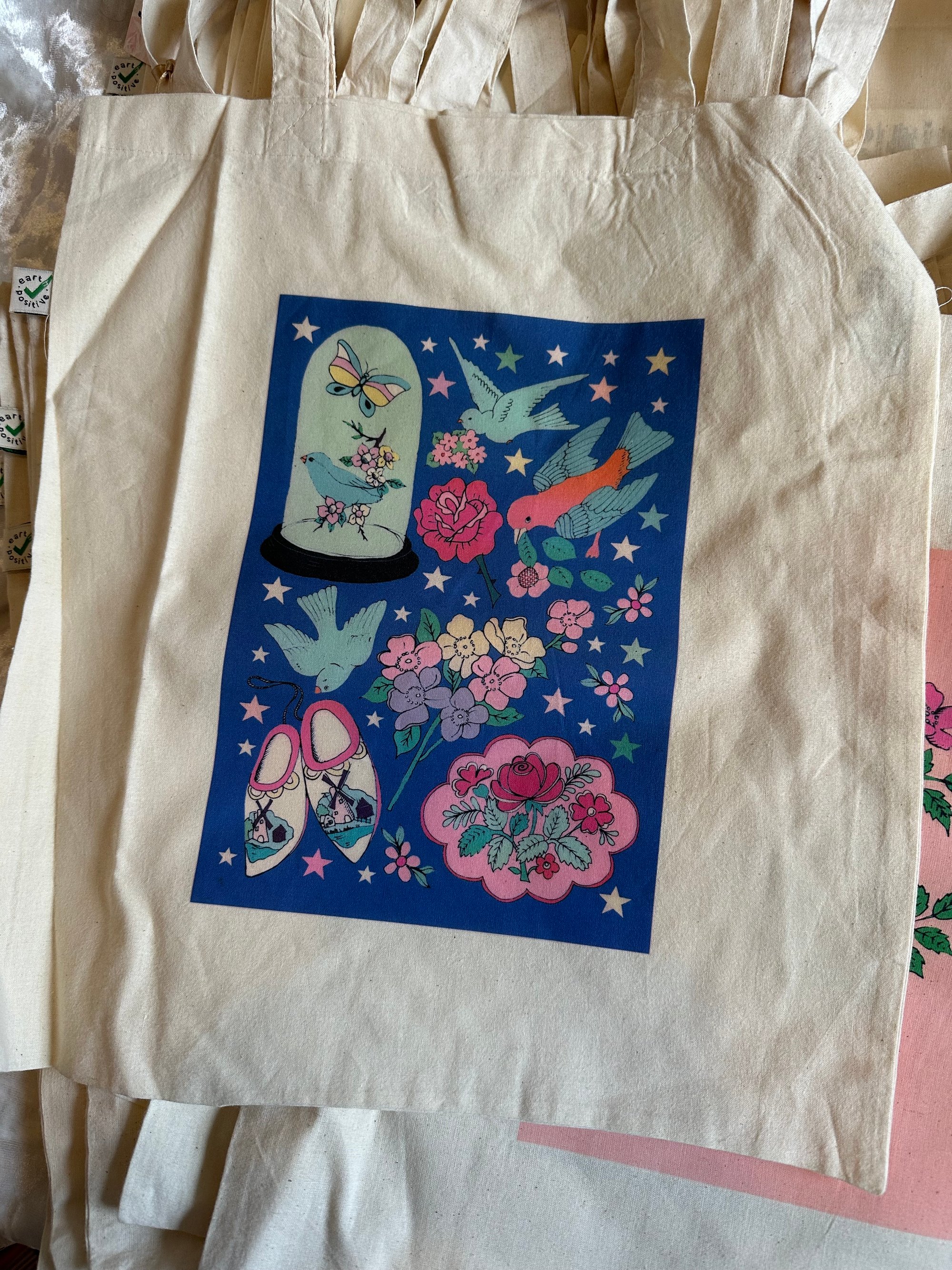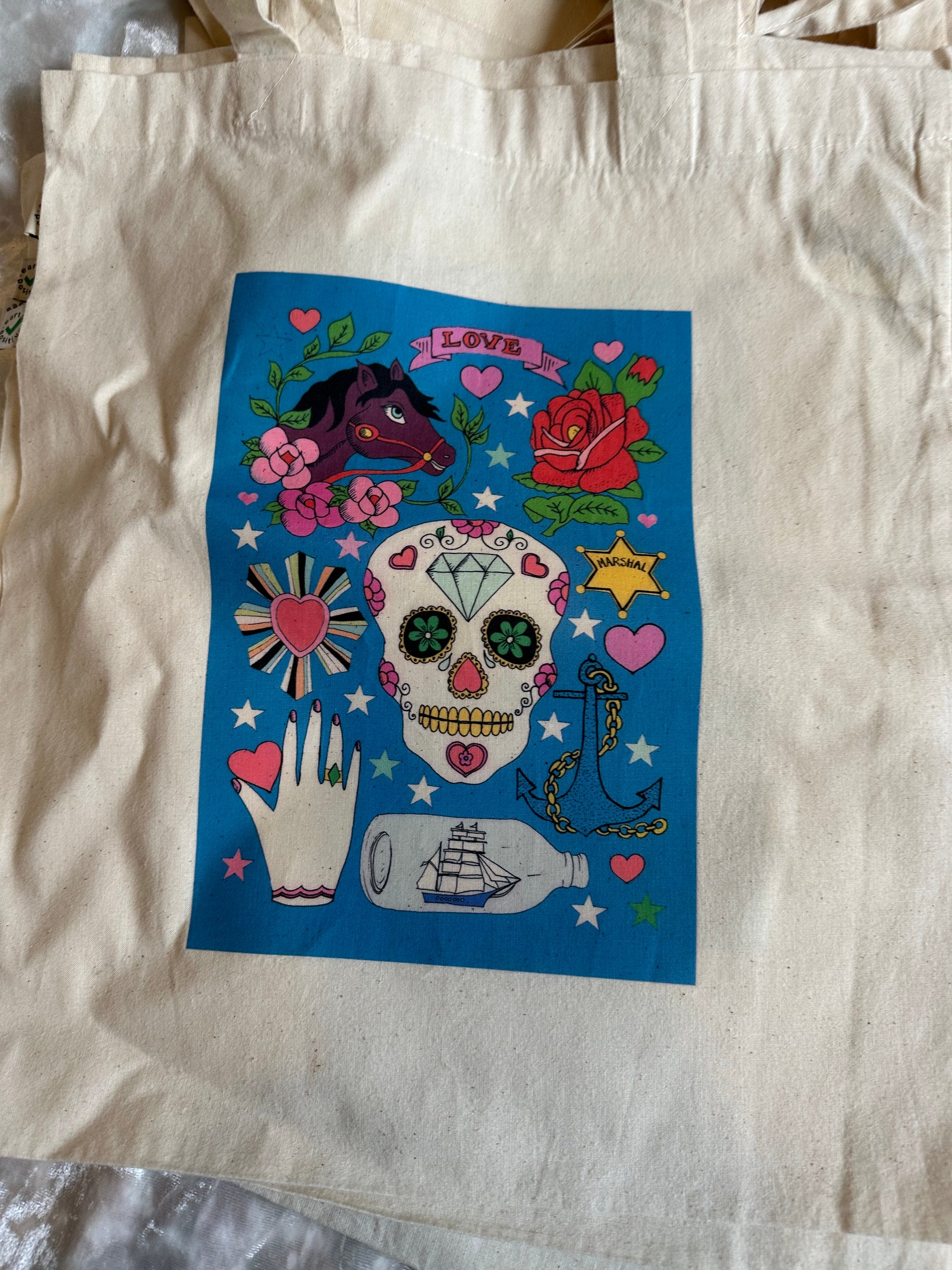 Classic cotton tote bags handmade in our studio with a variety of Alphabet, Tattoo designs and Iconic Figures Illustrations. Some of the bags are Earth Positive made using renewable energy from wind and solar and some are Salvage made from recycled fibres.