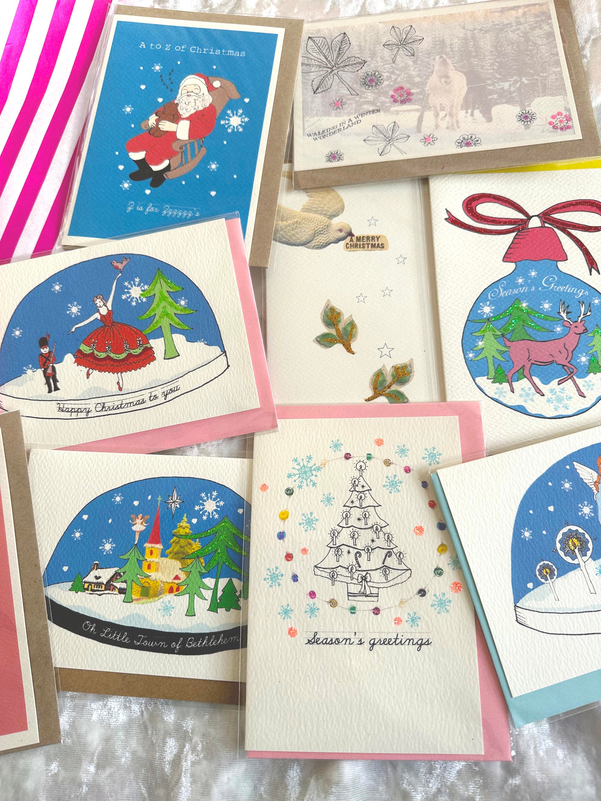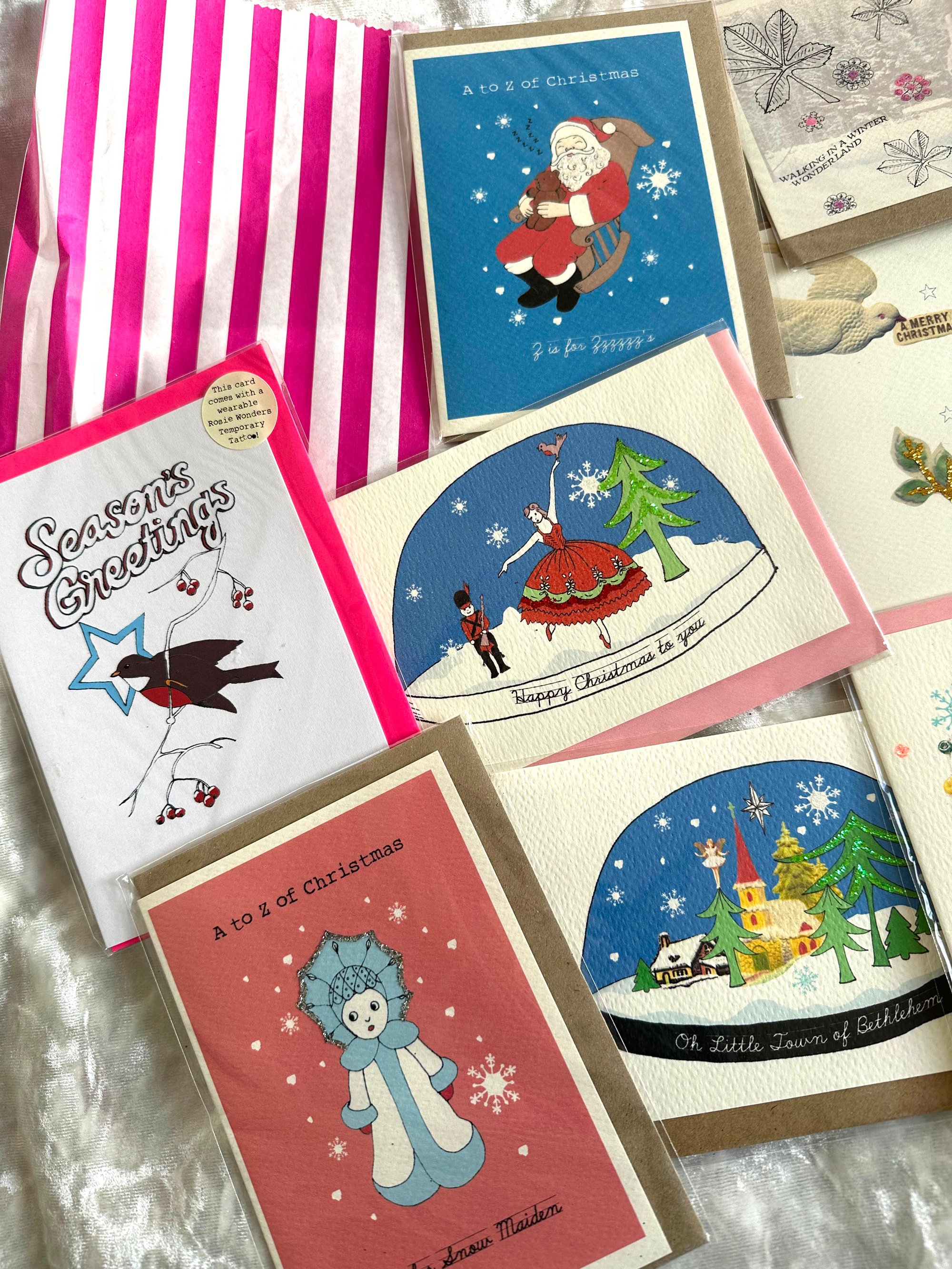 A selection of 10 Christmas Cards from across our previous collections. Packed in a candy stripe bag. The photos show examples of the packs, which will not have duplicates but may include more than one design from one collection.